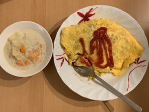 (オムライスのチキンライスに初めてニラを入れて見たんだけど、意外にも合っていて美味しかった!)