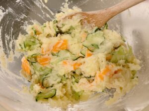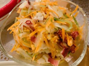 夜ご飯に、ポテトサラダ、タコのマリネ、ささみチーズ梅しそ春巻きを作りました。