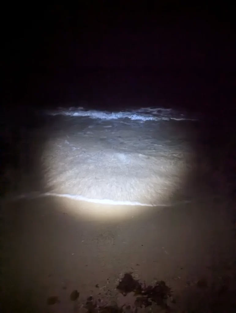 食事が終わった後、店主さんがヤシガニと蛍を見に、夜の海に案内してくれた。